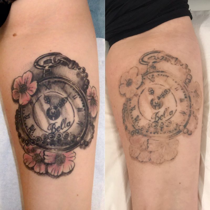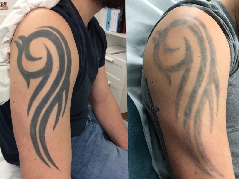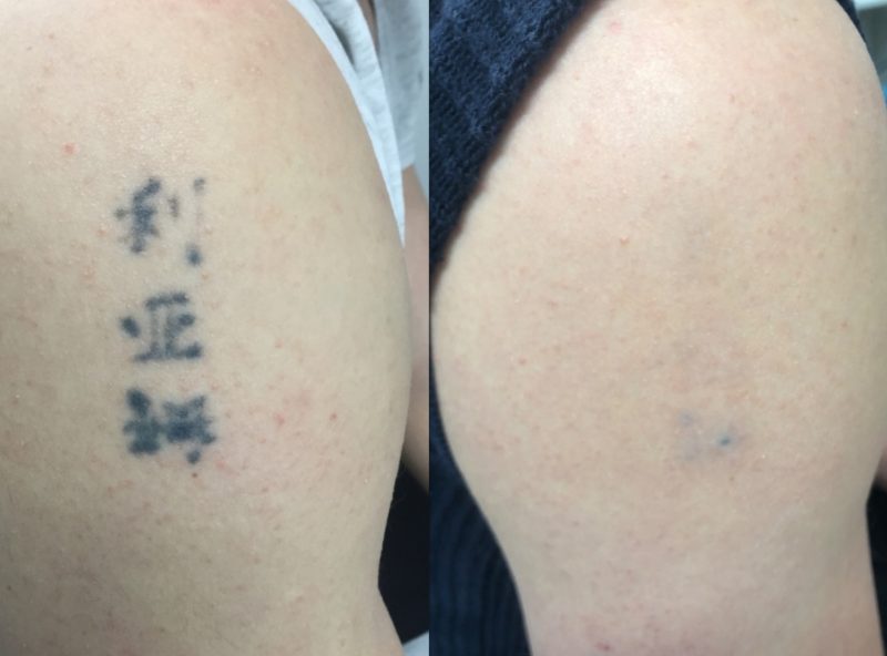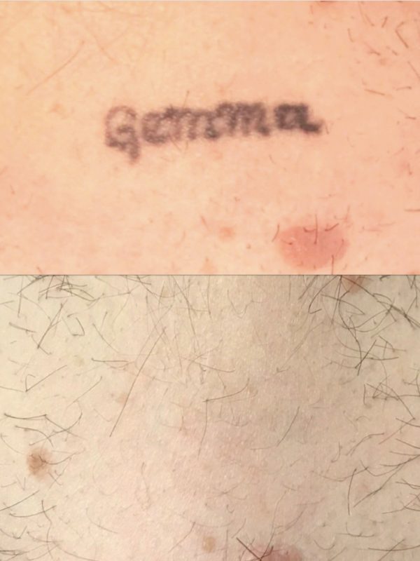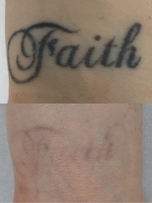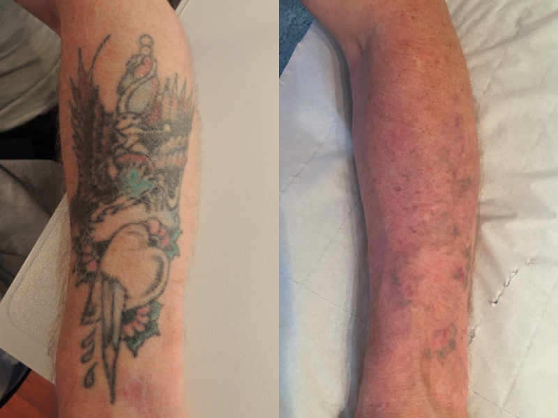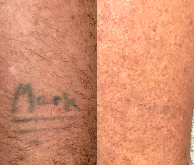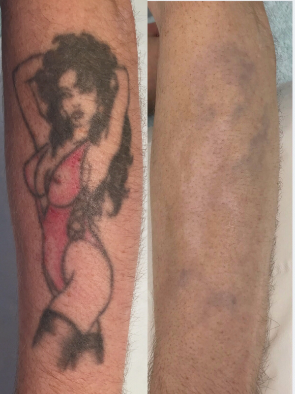 Pre-treatment photo shows little fading after 2 conventional laser treatments. But tattoo almost gone after 6 Picosure treatments